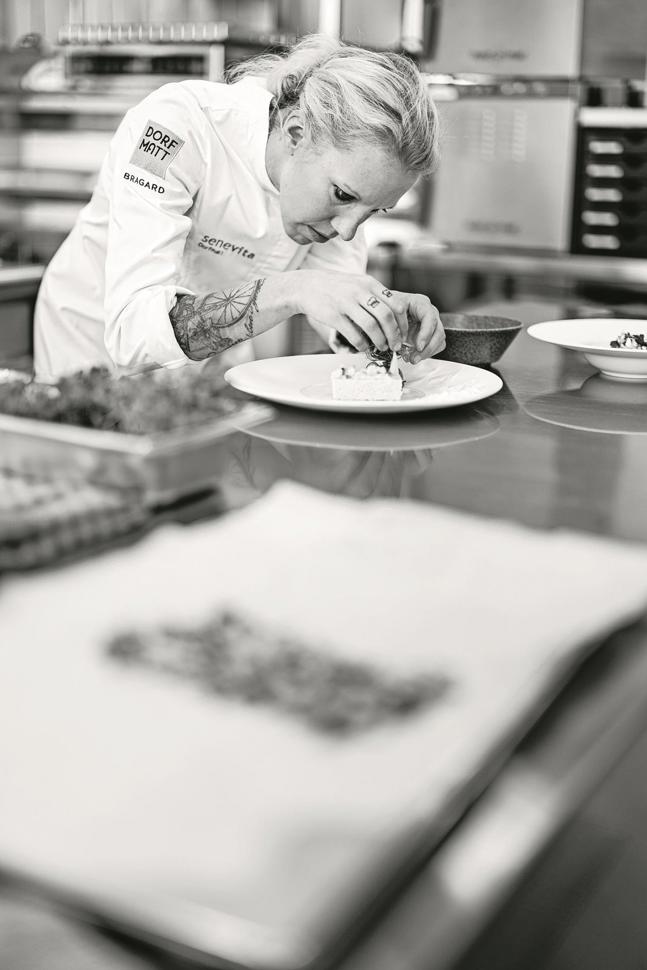 Wir sind sehr stolz, dass wir das À-la-carte-Lokal seit der Eröffnung im Mai letzten Jahres etablieren konnten und inzwischen eine treue Stammkundschaft haben. Unser Ziel als Küchenteam ist es nun, das Restaurant jeweils donnerstags, freitags und samstags auch abends zu öffnen – mit einer kleinen Karte und einem Gourmetmenü in sechs Gängen. Das wäre so schön! Momentan befinden wir uns dafür in der Aufbauphase, und wenn alles gut läuft, können wir vielleicht im ersten Quartal 2024 starten. Damit der Betrieb auch als öffentliches Restaurant funktioniert, müssen wir meiner Meinung nach in erster Linie mit der Zeit gehen und von der Altersheimküche im herkömmlichen Sinn etwas wegkommen. Im Prinzip führen wir zwei Karten: eine Menükarte, aus der auch unsere Bewohnerinnen und Bewohner wählen können, und eine grössere Saisonkarte fürs öffentliche Publikum, dem wir uns moderner und mit mehr kulinarischen Spielereien präsentieren. Diese Spannbreite braucht es.