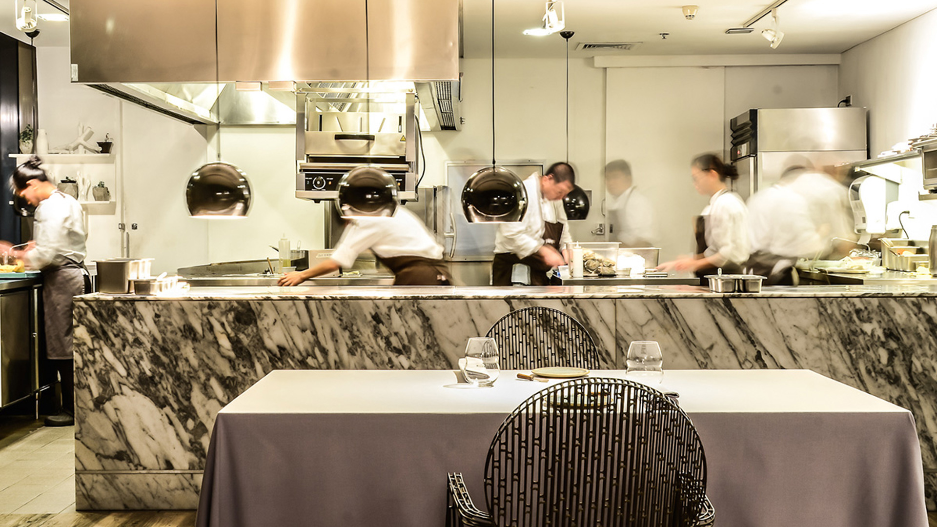 Im Restaurant, sieben Stockwerke tiefer, ist es auch eher frisch. Doch irgendwann im Laufe der Menü-Zeremonie bittet man einen hinaus in die ortsübliche Wärme auf die mit Kräuterbeeten geschmückte Terrasse, schneidet ihm vom asiatischen Koriander auf die Hand, lässt probieren. Man darf einen Moment entspannen und den Blick über die Stadt geniessen, bevor es weitergeht, Schlag auf Schlag. Gang um Gang kommt aus der offenen Küche, wird nett erklärt.